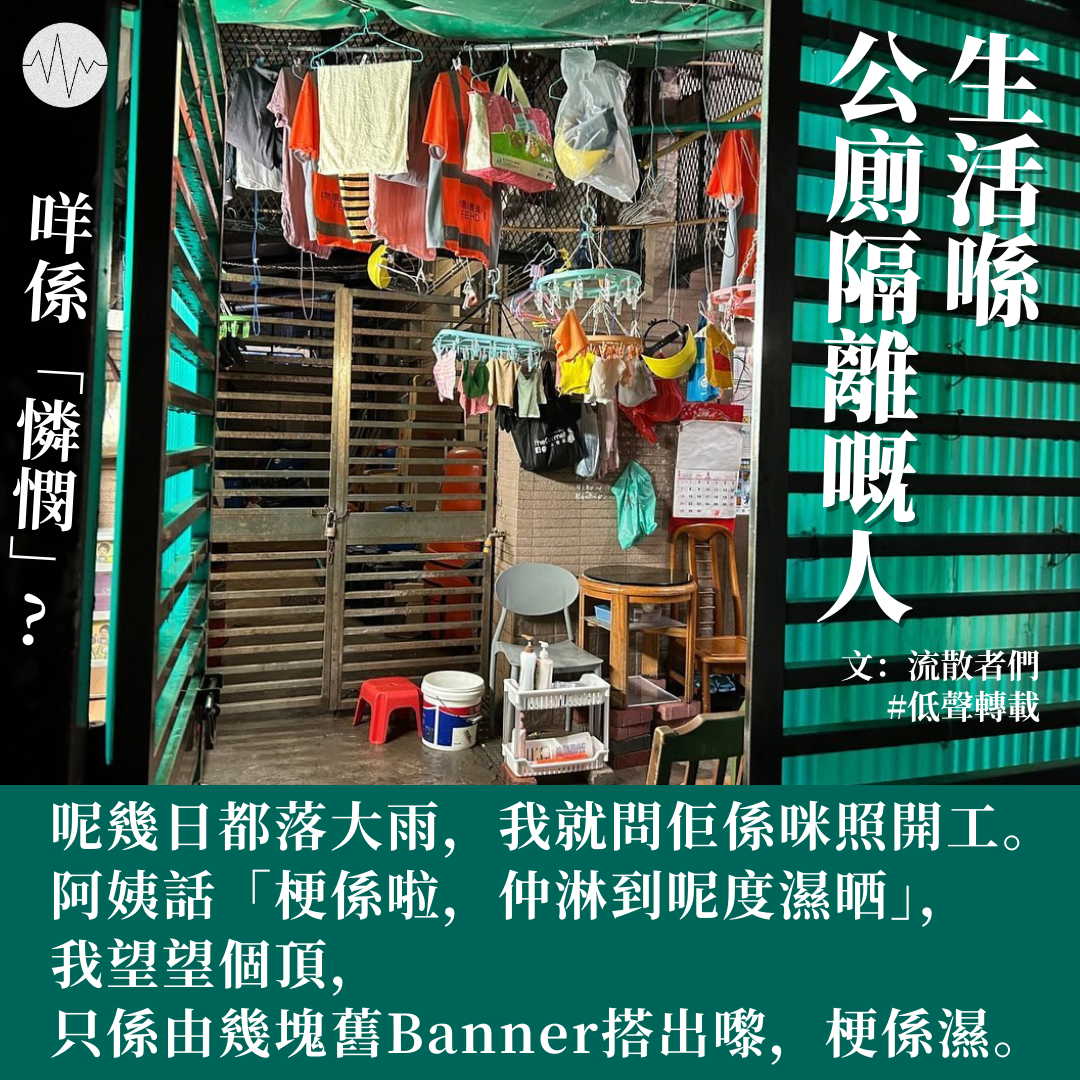 天黑,路過公廁前嘅後巷,見到有道光滲出嚟。行過之後又小小在意,就返轉頭望望。一眼望埋去,有鞋、襪、衫、褲、毛巾、衣架、水樽、環保袋⋯⋯仲有檯櫈風扇。公廁隔離竟然有人住?
