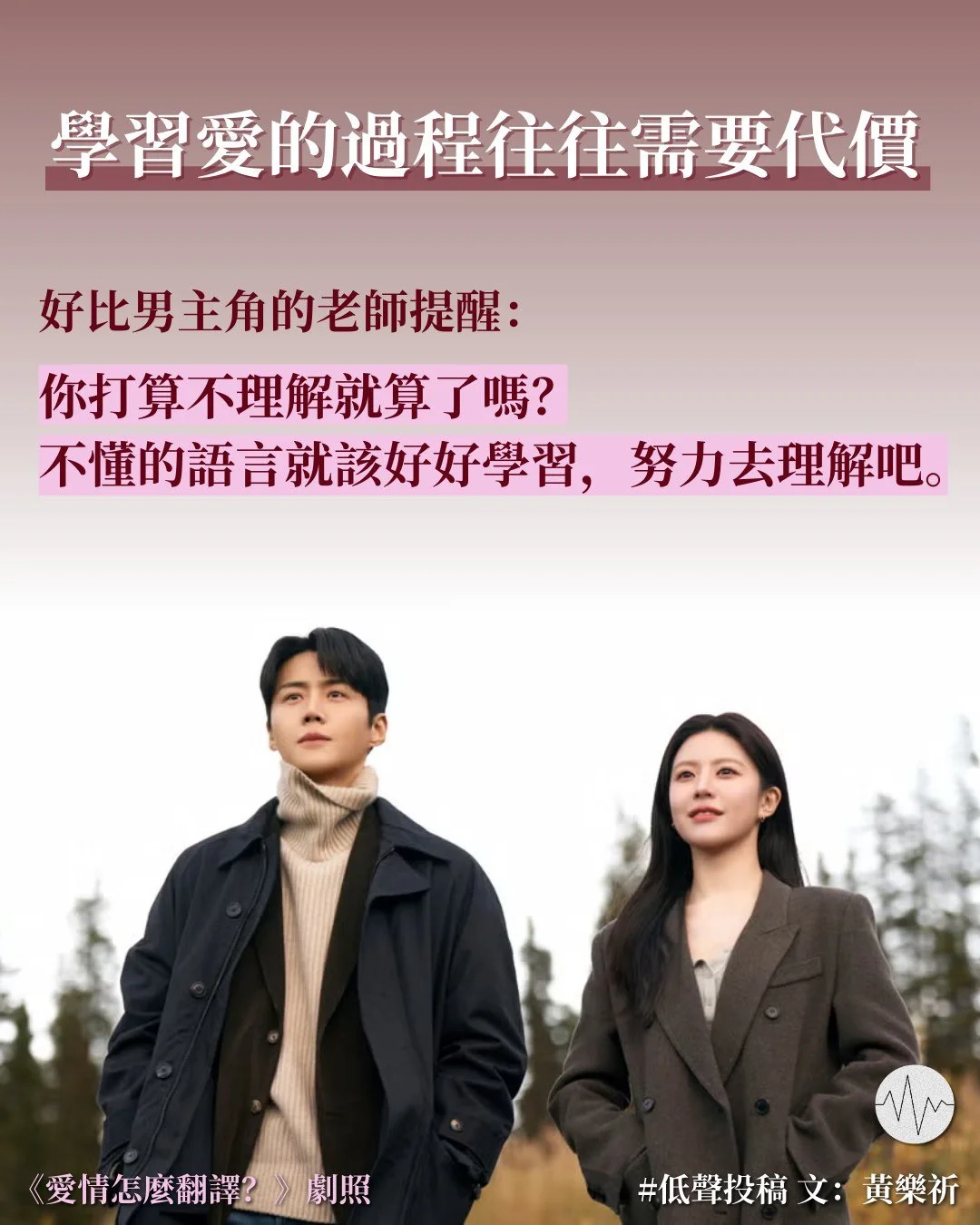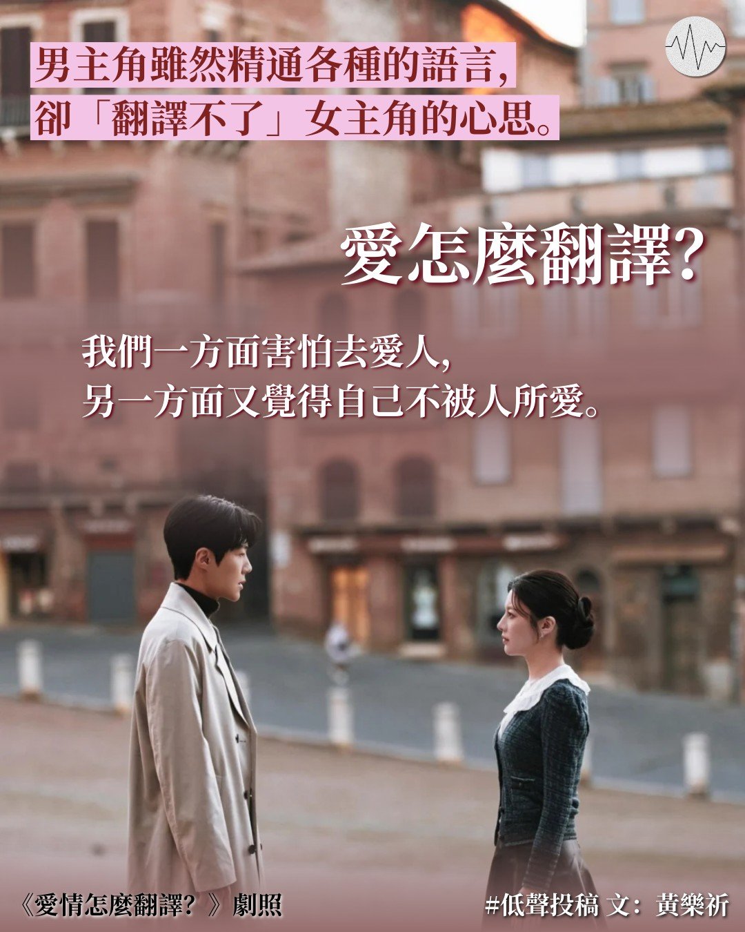 由南韓演員金宣虎與高胤禎主演的韓劇《愛情怎麼翻譯?》近日在Netflix上架後,旋即在各個媒體「洗版」。人們除了關注男女主角的顏值、CP感,以及對劇中的取景之地作「聖地巡禮」,故事的深度也成為了大家討論的重點之一。劇情的主軸環繞著口譯員周浩鎮(金宣虎飾)與忽然冒起的女演員車茂熙(高胤禎飾)相識與相愛的過程。這兩位受各自原生家庭影響深遠的成年人,始終陷入各種的誤會中而遲遲未能開花結果。男主角雖然精通各種的語言,卻偏偏讀不明白、「翻譯不了」女主角的心思——這可謂劇名的由來。