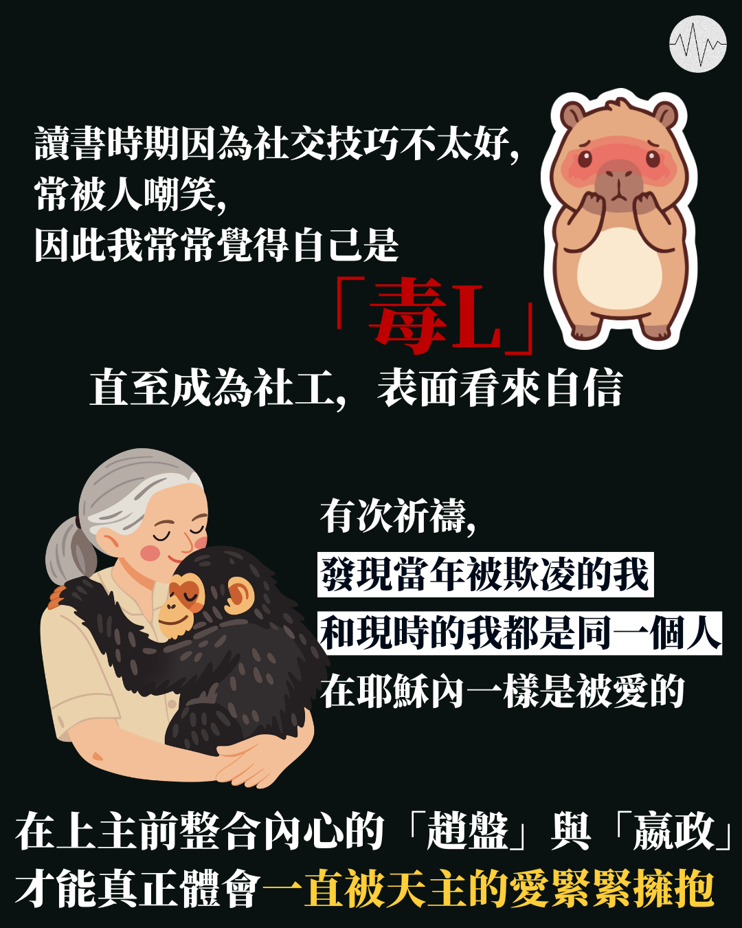 這讓我想起數年前的一次避靜。當時因工作壓力與感情挫敗,我渴望在避靜中疏理自己。人在安靜的環境下,很多感受會慢慢湧現,我想起讀書時期因為社交技巧不太好,常被人嘲笑,因此我常常覺得自己是「毒L」。直到工作後成為家庭服務的社工,在教會內又成為小團體的領袖,別人表面看我在各種工作坊或講座中能夠自信地上台主持活動,搞氣氛,其實每次上台前,我內心都十分恐懼,好害怕因為「講錯野」被取笑。直到在避靜中,當回憶以往的經驗,我不想再面對當年,那個被視為「毒L」的自己。