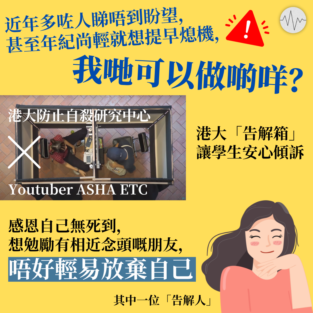 港大防止自殺研究中心不但研究自殺情況,更在2017-18年與幾個Youtubers合作,在校園舉辦活動預防自殺。長著西人面孔卻能說流利廣東話的Youtuber ASHA ETC就在港大辦過一次「告解箱」活動,雖然沒有天主教「告解」的「認罪」意思,卻仍有「安心傾訴」的意義。