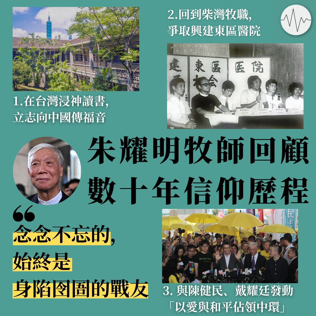 久未現身露面的朱耀明牧師,近日受訪談及近年定居台灣的生活,回顧自己參與社會的歷程,並指自己有個無法解開的心結,就是不能回港與身在獄中、面對審訊的戰友同行。
