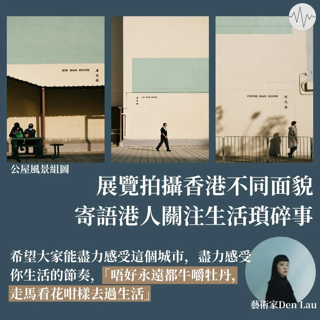 其中一組作品是公屋組圖,相片捕捉了屋邨的幾何建築設計和邨民的生活,Den認為舊屋邨「才有這樣的味道」,「嗰個味道我唔想再講係人情味,呢啲好『起雞皮』、陳腔濫調」。舊屋邨最吸引她的是設計,每個設計都基於該地區的特性,例如葵盛西邨是按照地形,依山而建,許多舊屋邨的公共空間和生活規劃的設施都關乎當區的需求,是「tailor-made」的。有了這樣的視角,在不同的舊屋邨才會看到不同的風景。