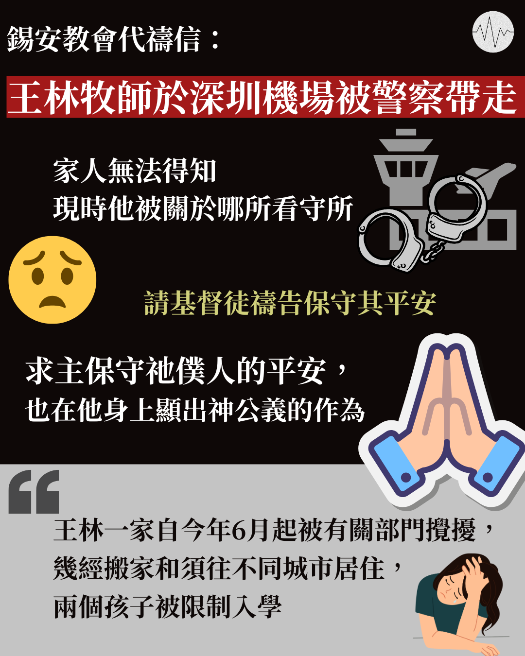 錫安教會代禱信:王林牧師於深圳機場被帶走 無法得知被關地點
