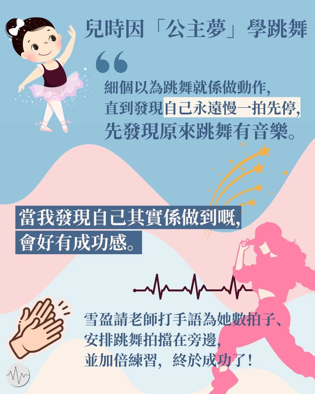 全部同學都因為她而需要反覆練習,令她感到很挫敗。後來雪盈找方法克服,包括老師打手語為她數拍子、安排一個跳舞拍擋在她旁邊、加倍練習等。「當我發現自己其實係做到嘅,會好有成功感。」雪盈至今仍然熱愛跳舞,更有朋友會請教她跳舞的技巧。