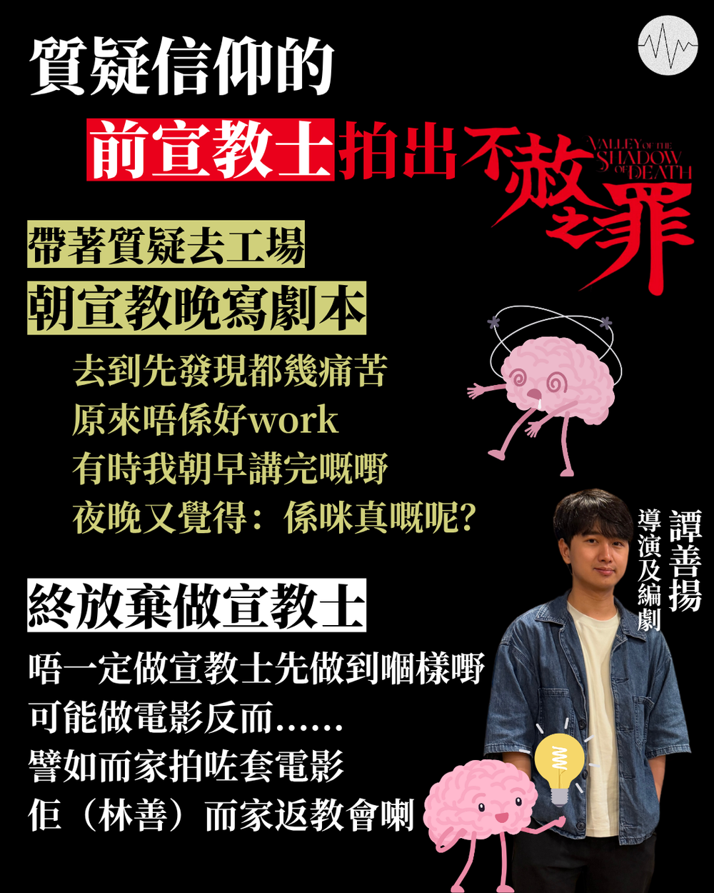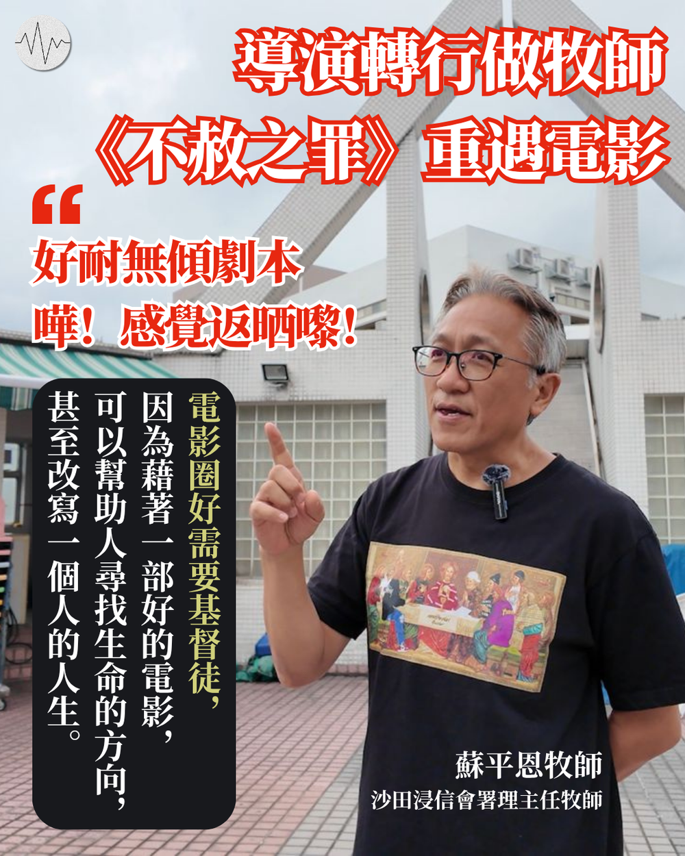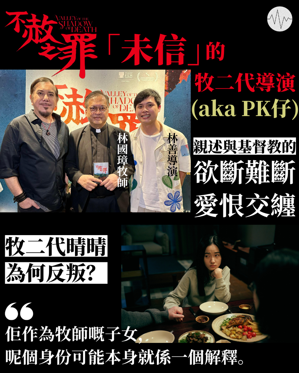電影《不赦之罪》上映以來引起不少信仰討論,《低聲道》早前舉辦《不赦之罪》電影場景導賞團,與讀者重返電影拍攝場地沙田浸信會瀝源座堂,由電影的故事內容顧問、沙田浸信會副主任牧師蘇平恩導賞。導賞團後設電影分享座談會,飾演師母的蘇玉華和飾演晴晴的陳書昕更分享個人對基督教信仰的經歷和看法。蘇玉華曾返教會並受浸,卻在短時間內離開了。陳書昕則與其角色同是信二代,經歷過尋找神與自己關係的過程。