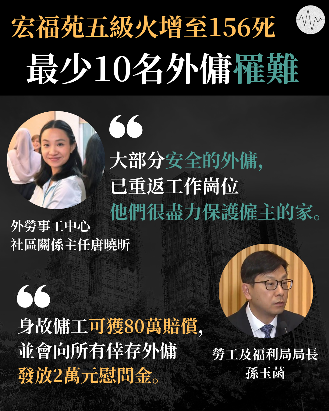 宏福苑大火外傭至少10人死亡 孫玉菡:身故外傭可獲80萬港元補償