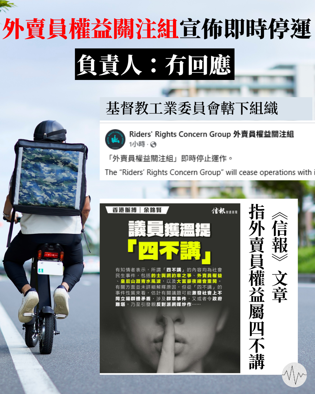 近日《信報》一篇文章指有立法會議員獲溫馨提示「四不講」,不能講的議題包括外賣員權益、的士與網約車之爭、皇后山瀝青水風波及大富豪夜總會重開。適逢外賣權益關注組停止運作,未知與「四不講」是否有關。