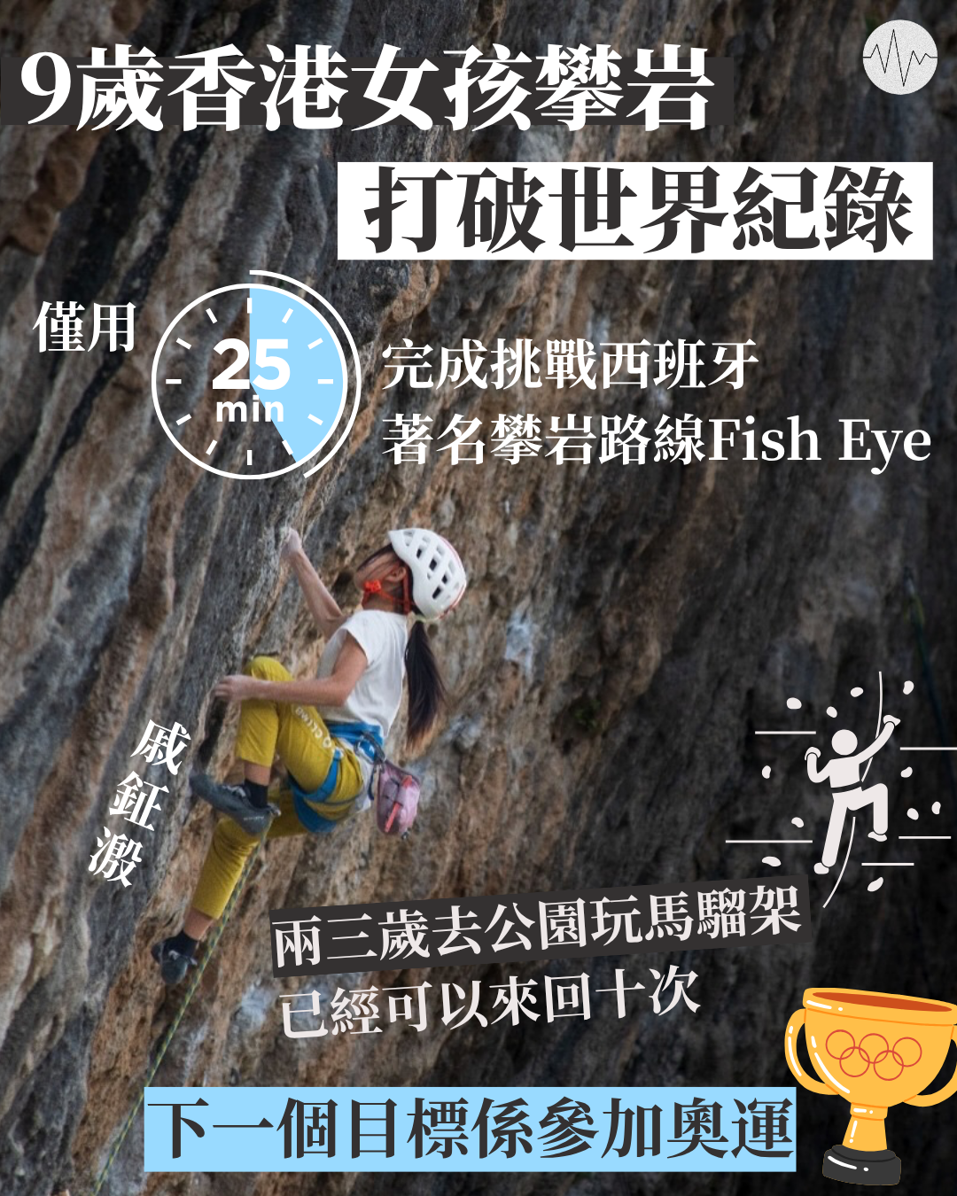 「我覺得好玩!」打破世界紀錄的戚鉦溵(Veronica)如此形容攀岩。年僅9歲的她已是一位香港攀岩運動員,曾參加多個比賽並獲獎無數。7月8日,Veronica在西班牙 Oliana 攀登著名路線 Fish Eye(魚眼),成為最年輕成功完成 5.14b(8c)難度路線的攀岩者,並獲得健力士世界紀錄。今早(18日),在商台節目中被問到攀岩是否很難時,她輕鬆回答:「OK啦!」