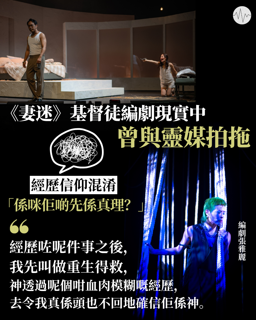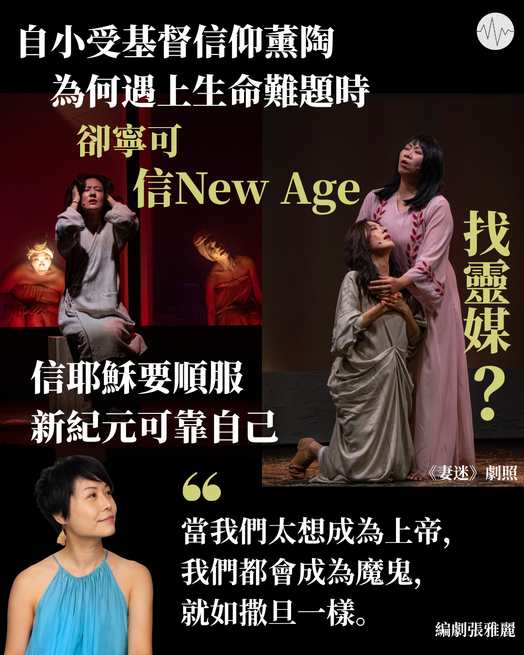 自小受基督信仰薰陶,為何遇上生命的難題時,卻寧可信New Age、找靈媒?舞台劇《妻迷》中妻子(唐詩詠飾)將生育看成人生意義,奈何與她丈夫(朱栢謙飾)始終無法如願,最終選擇相信靈媒,卻反迎來最殘酷與絕望的終局。負責改編的張雅麗在「編劇的話」的結尾,引述了兩段《聖經》經文,然後以這句話作結:「當我們太想成為上帝,我們都會成為魔鬼, 就如撒旦一樣。」