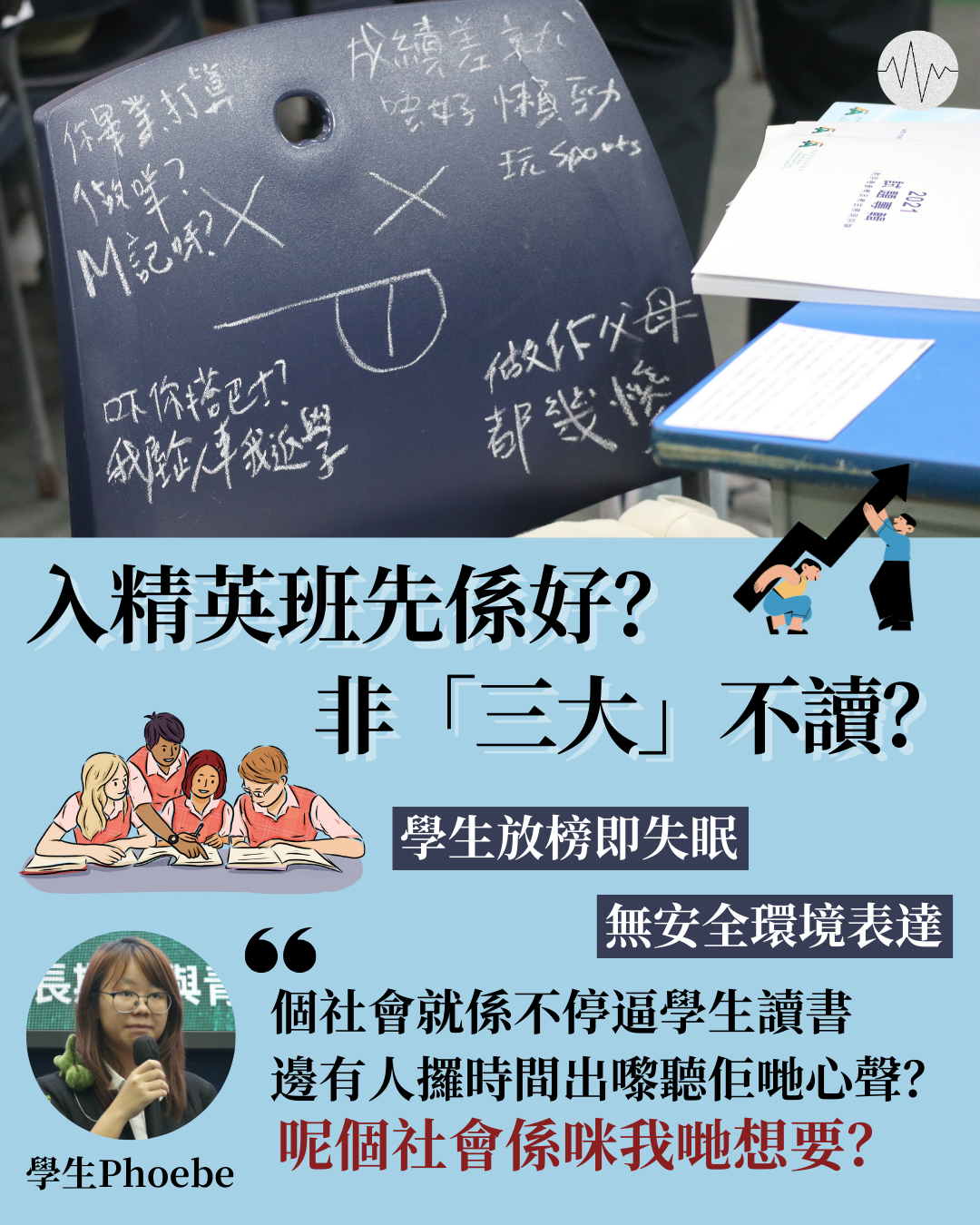 上月文憑試(DSE)放榜前的一晚,考生Phoebe一夜未眠,整晚擔心未能入讀心儀科目。當學生面對沉重的壓力,Phoebe更認為青少年在社會中並沒有溫馨和安全的環境,可以好好表達心聲:「個社會就係不停逼佢哋讀書,邊有人攞時間出嚟聽佢哋心聲?」她提到香港社會偏向擇優取錄,只有成績好的精英能夠留下來,但她認為教育的作用應是培育,而非淘汰學生。