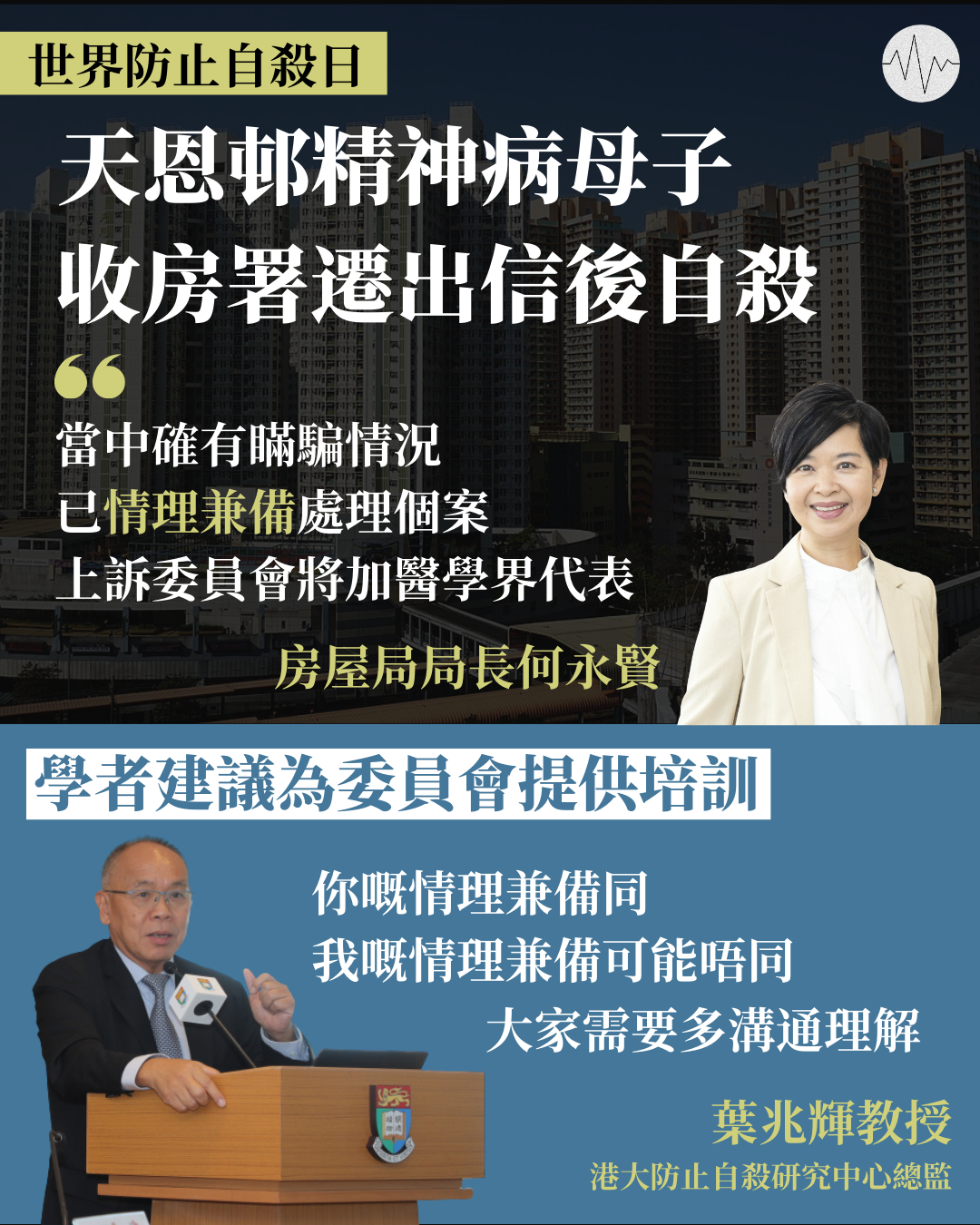 天水圍天恩邨一對患精神病母子涉在申請公屋時未如實申報資產,去年11月遭房屋署要求遷出,在青山醫院發證明書建議容許二人繼續居於該單位後,上訴委員會今年3月確認「遷出通知書」,兩母子分別於4月和7月墮樓身亡。房屋局局長何永賢昨表示已「情理兼備」處理個案,日後或會物色有醫學背景者加入上訴委員會。香港大學防止自殺研究中心總監葉兆輝認為,問題不在於醫學,而是對弱勢社群的敏感度和同理心。