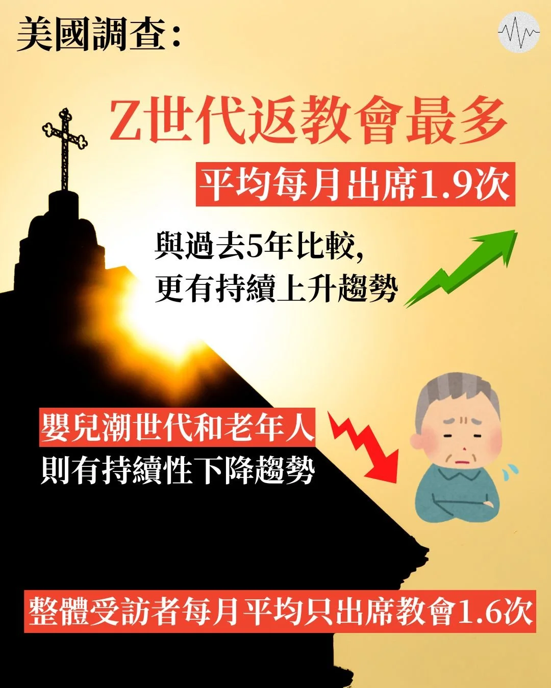 可能很多人認為年輕一代普遍對教會的興趣不大,亦曾經納悶教會有青黃不接的情況。但研究機構巴納集團(Barna Group)九月初發表調查報告,發現美國教會出席率最高的一群為Z世代,平均每月出席1.9次,其次為千禧世代(Y世代,1.8次)。而X世代則平均每月出席1.6次,最少是嬰兒潮世代和老年人,各平均每月出席1.4次。研究自2000年至2025年7月期間,在美國對超過13萬名成年人進行抽樣調查,更收集超過五千次線上訪談。