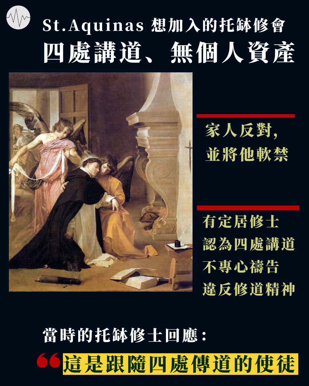 阿奎那想成為道明會的托缽修士時,曾遭家人反對,甚至軟禁。雷競業指,阿奎那出身貴族,自小被送到本篤會修院實習,期待他將來出任院長,增加家族名氣。但阿奎那想加入的,卻是沒有固定資產、四處講道、靠捐獻過活的托缽修會,當然引來家人反對。雷競業又說,即使在修會之間也常有攻訐,托缽修士四處講道,就被某些定居的修士批評是「違反修道精神」,沒有專心禱告親近上帝;而托缽修士的回應是,他們是跟隨四處傳道、醫病的使徒。