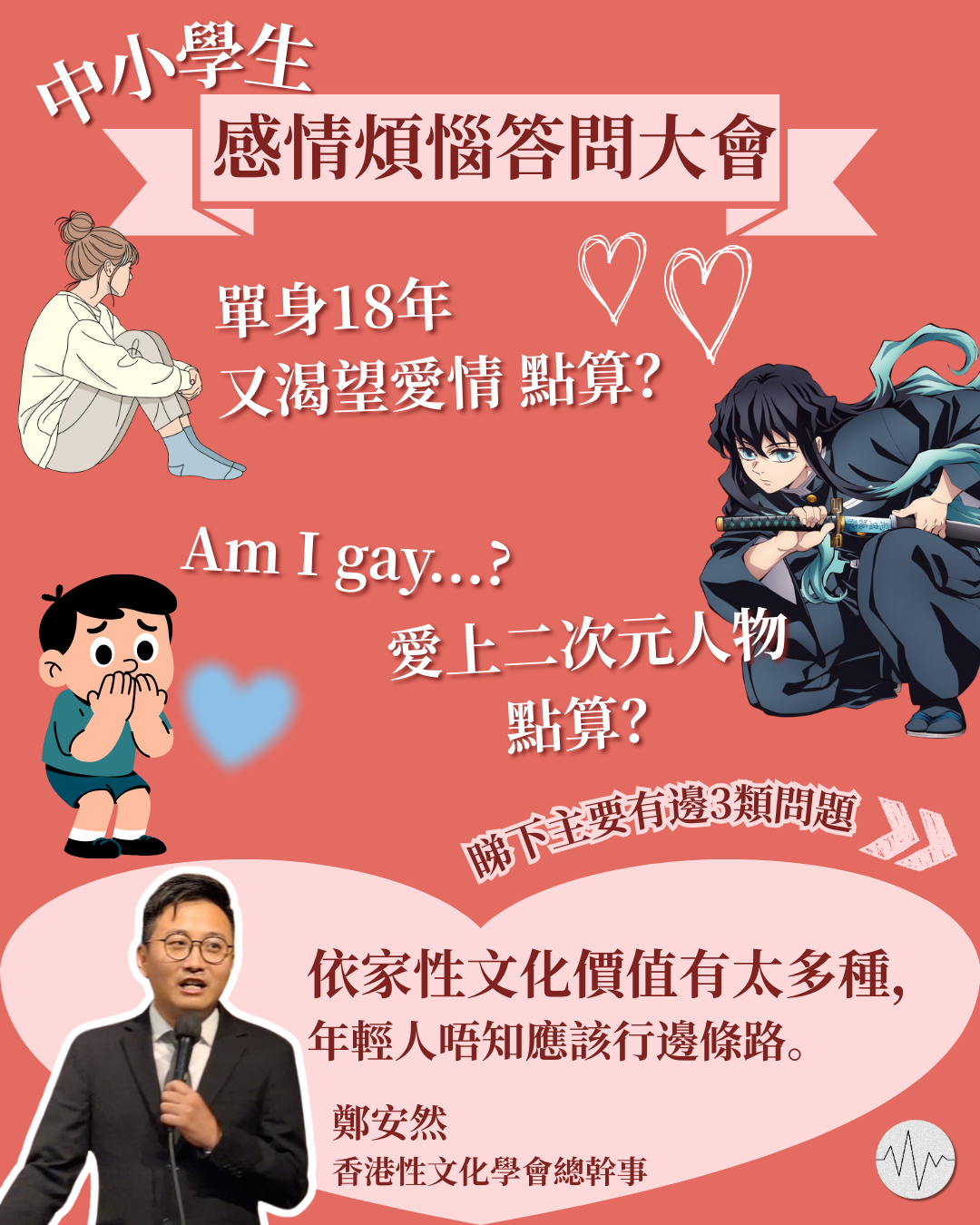 「單身18年又渴望愛情,怎麼辦?」、「Am I gay?」、「愛上二次元人物,點算?」你曾經有冇類似嘅疑問?以上的疑問都是香港性文化學會總幹事鄭安然從中小學生中收集到的問題。他常到中小學主持性教育講座,解答學生與感情相關的問題。他指出,這世代的年輕人容易接觸性話題,迷失於多種性文化價值觀之中,他呼籲成人要保持開放的心態聆聽和了解年輕人的世界,再與他們同行,為他們解開迷思。