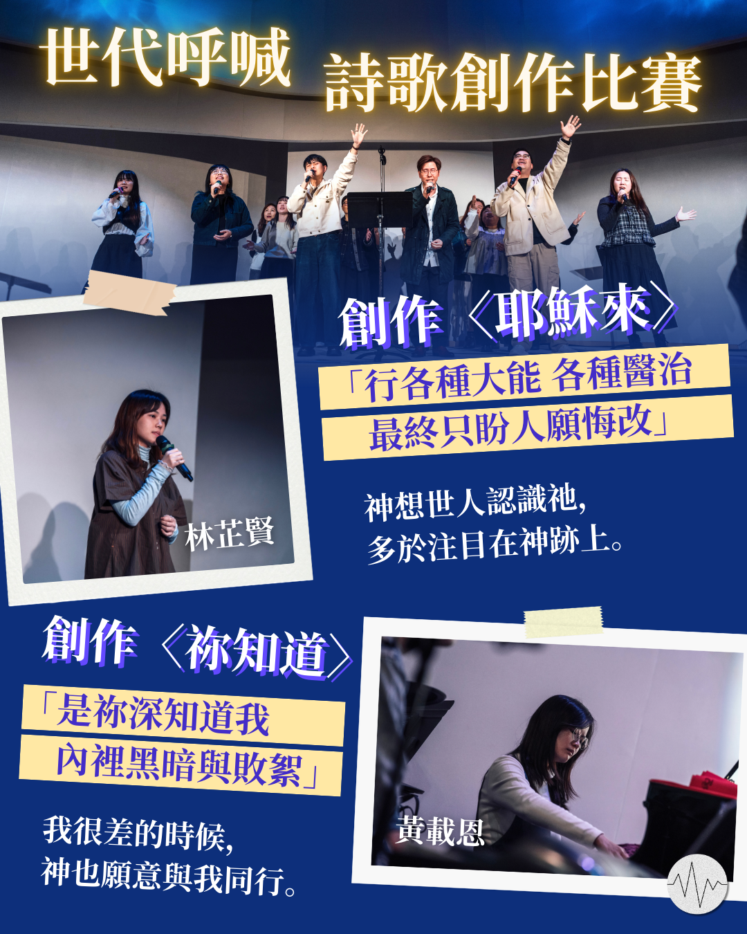 如果讀聖經時有些感受或領受,你會用甚麼方式記下來?有人會把領受寫下來,有人選擇畫下來,也有人會以音樂的方式表達,創作詩歌。香港基督徒音樂事工協會(ACM)舉辦「世代呼喊2——ACM全球華人粵語詩歌創作大賽2025」,其中10個得奬參賽單位在作品發佈音樂會中現場演繹歌曲。有得奬者表示希望透過詩歌創作向神傾訴心聲,又以音樂向眾人分享福音,也有得奬者感恩能藉比賽認識更多基督教音樂創作人。