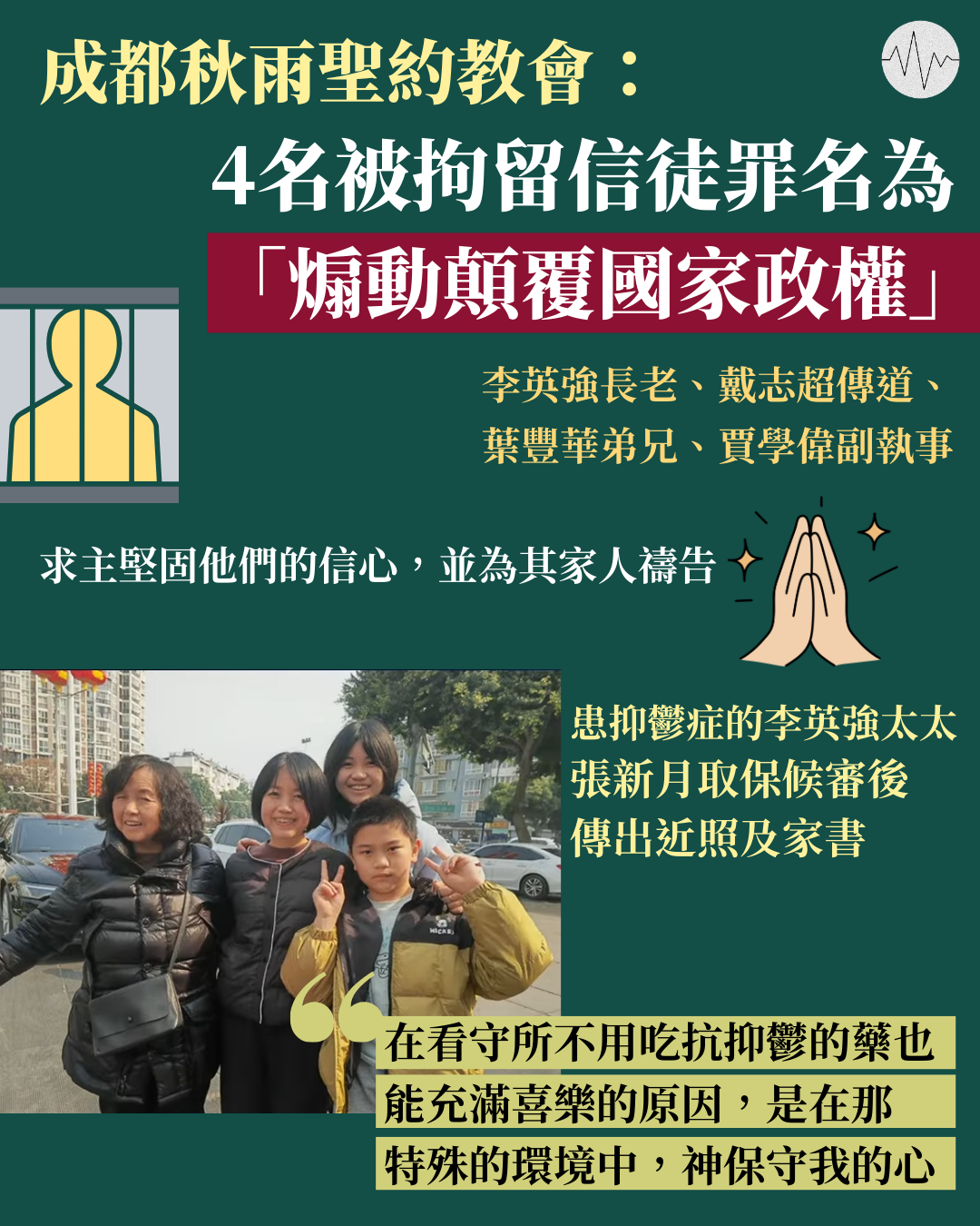 內地家庭教會成都秋雨聖約教會1月6日有多位信徒領袖被捕,教會早前發佈消息指,該會的李英強長老、戴志超傳道、葉豐華弟兄、賈學偉副執事都被指涉嫌「煽動顛覆國家政權」罪。