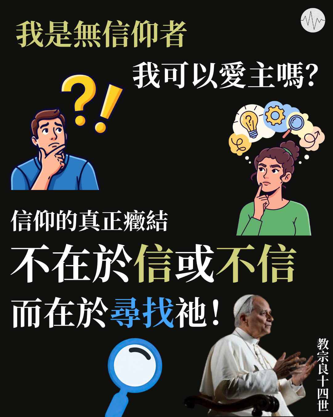 無信仰者可以愛主嗎?這是意大利人羅科(Rocco)向天主教教宗提出的疑問,他認為自己不信,並且「對虛無絕對的堅信」,但他卻不斷渴慕天主,內心的掙扎和不安也在於天主。教宗良十四世回答時指出,真正的問題不在於信或不信,而在於尋找天主,這正是我們生命的尊嚴和美妙所在。