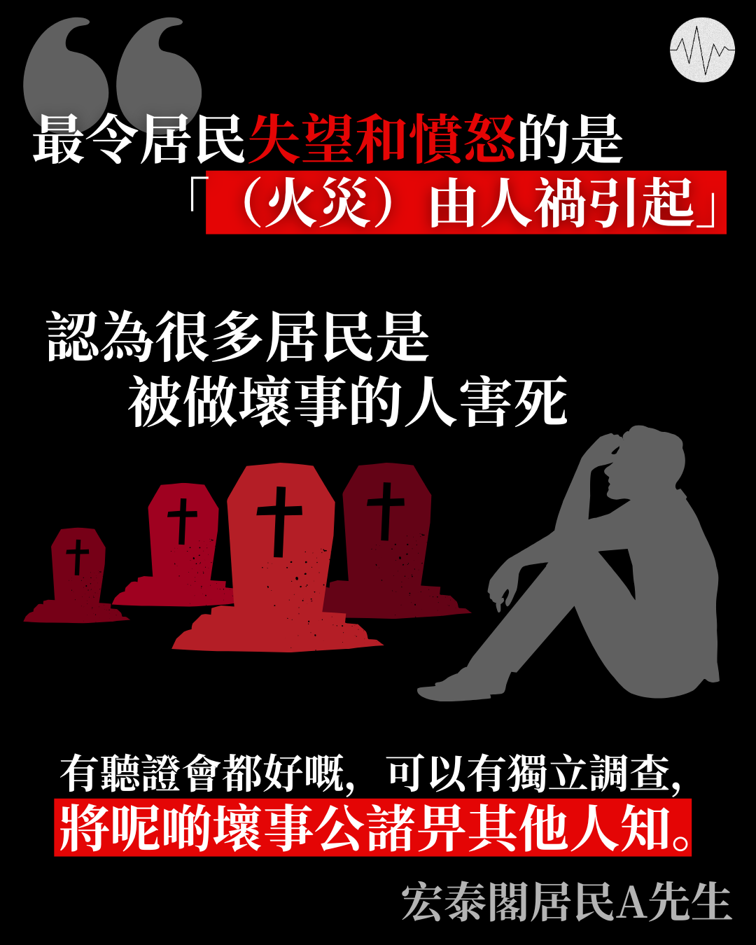 A先生認為,最令居民失望和憤怒的是「(火災)由人禍引起」。「有聽證會都好嘅,可以有獨立調查,將呢啲壞事公諸畀其他人知。」他期望聽證會繼續揭露火災內情,讓涉嫌違規和做壞事的人得到應得的懲罰。