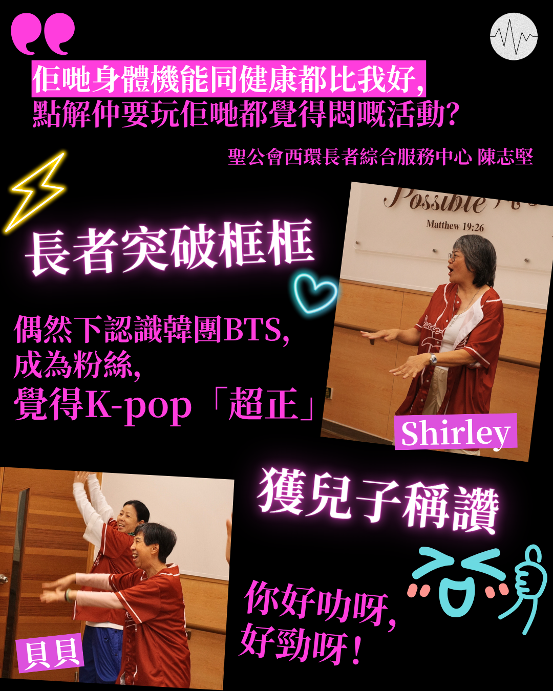 可能很多人以為長者活動不外乎太極、棋藝、伸展操等較為靜態的活動,但其實長者也可以充滿活力,穿上棒球衣、閃閃短裙,在台上大跳節奏明快的K-pop舞蹈。69歲的貝貝和64歲的Shirley就是K-pop長者舞團「CAN」的成員。早前他們到銅鑼灣街頭拍Dance Cover,以行動突破大眾對長者的固有想像,證明長者也可以散發活力,接受新挑戰。