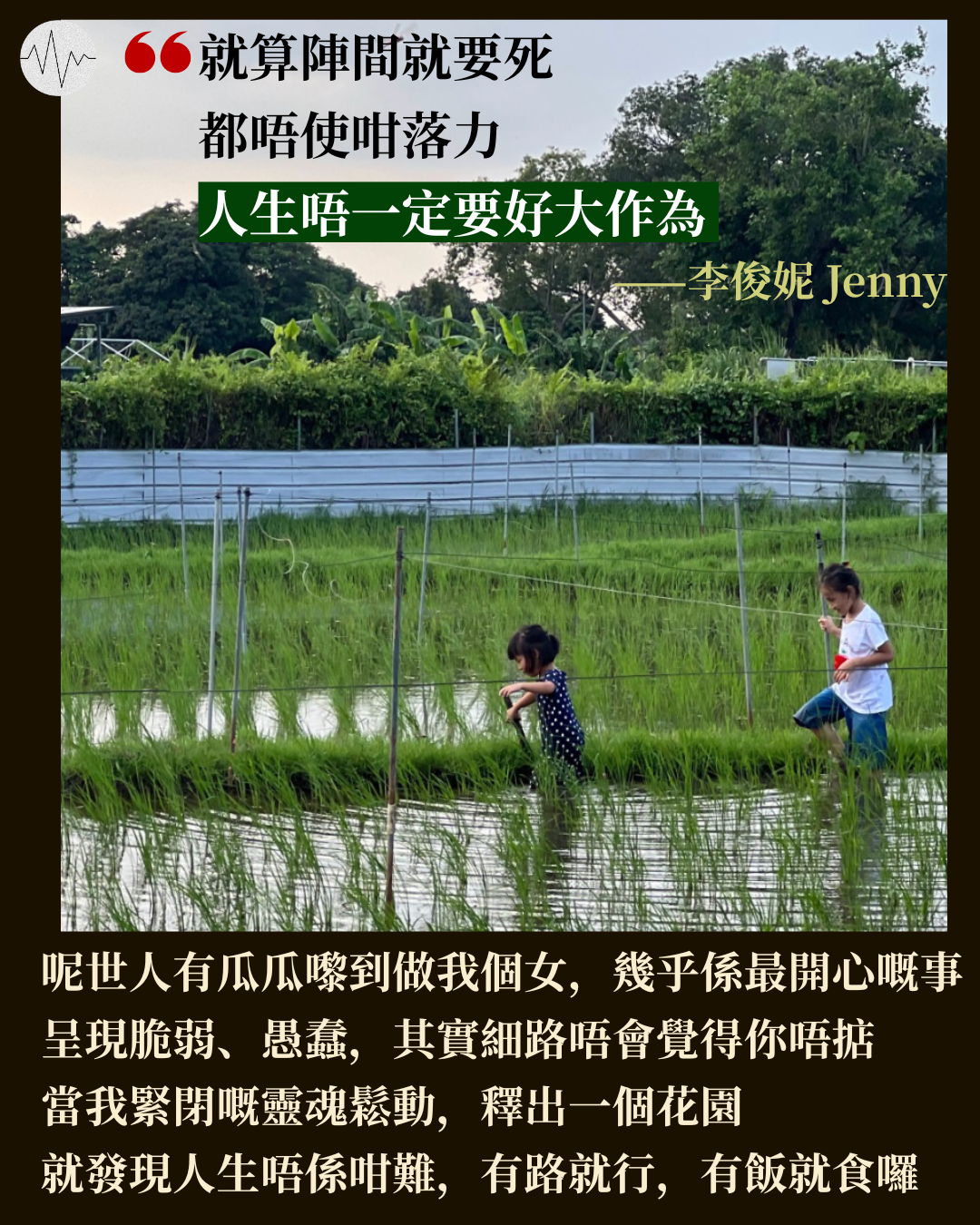 接納自己可以做錯,蠢、糊塗,Jenny 覺得自己本來緊閉的靈魂,釋出了一個花園般的空間,看見身邊其實有許多很好的人,笑說「自己應該都係個好人吧」。當瓜瓜跟她說:「好多謝你同爸爸整咗Seeds Lab,我覺得自己好幸福」時,Jenny 就知道,開田的路沒有走錯。