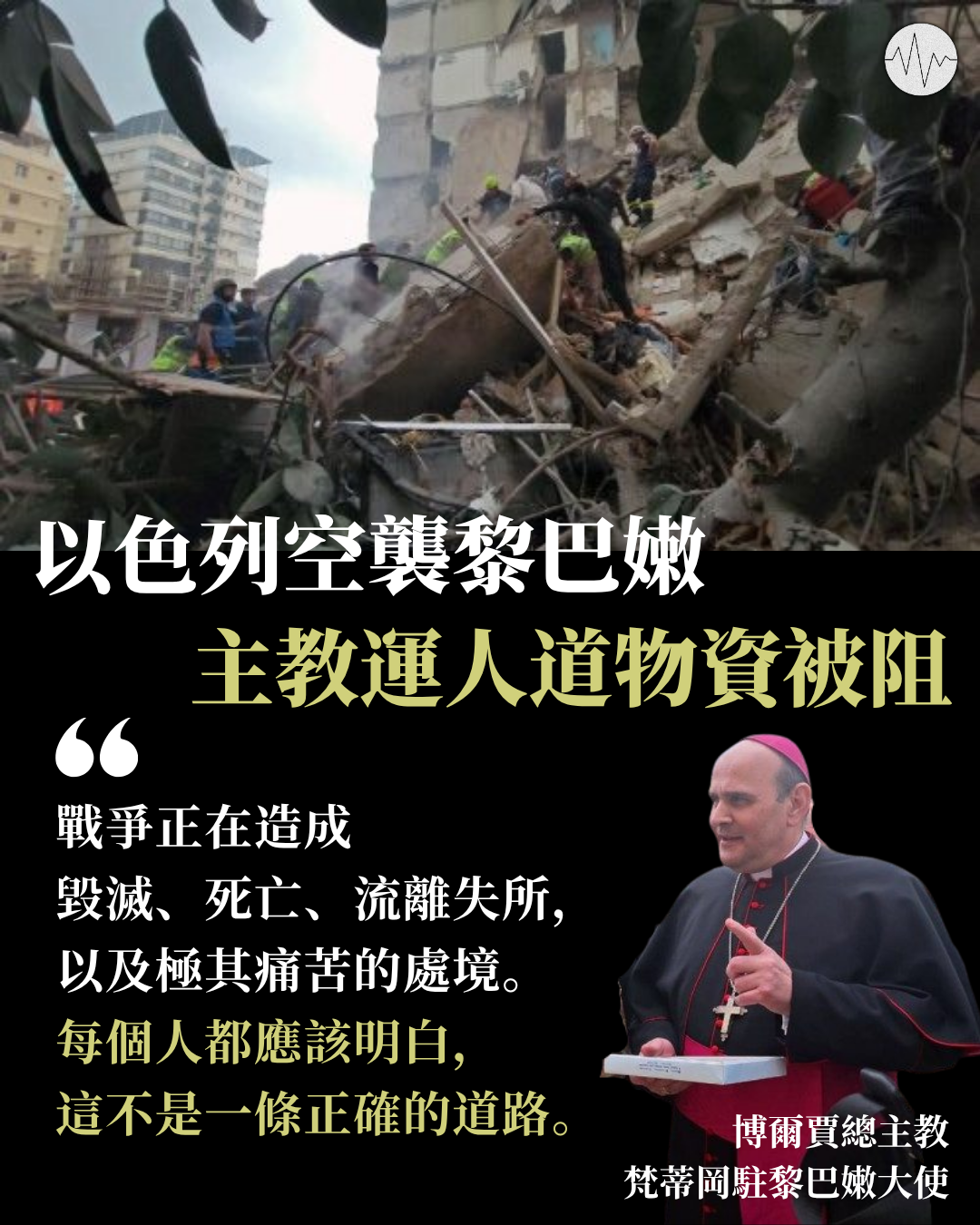 以色列週三(8日)起向黎巴嫩地發動大規模空襲,導致至少逾300人死亡。梵蒂岡駐黎巴嫩大使博爾賈(Paolo Borgia)總主教形容,首都貝魯特遭遇前所未見的襲擊,他們整天都在迫擊砲下度過,市中心充滿了警報聲和救護車聲。他指戰爭正在造成毀滅、死亡、大批的流離失所者,以及許多極其痛苦且難以應對的處境,呼籲盡快停火和展開談判。