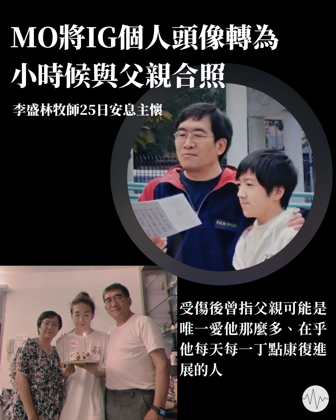 李盛林牧師逝世 MO將IG頭像轉與父親合照 26 Apr Written By The Voice 舞蹈員李啟言(MO)的父親李盛林牧師昨日(25日)安息主懷,MO即晚將其IG個人頭像轉為小時候與父親的合照。阿MO自2022年7月在演唱會事故受重傷後,父母從加拿大返港貼身照顧他,父親定期撰寫代禱信交代MO的康復進展。MO在受傷後首個IG帖文在2024年底發佈,指父親可能是世上唯一那麼愛他和真的在乎他每天每一丁點康復進展的人。經過三年多的努力後,MO在今年三月底發放自如地操控電動輪椅的影片。而在三日前,他亦發佈左手靠著滑板向前後推動的影片。 李盛林牧師李啟言 The Voice