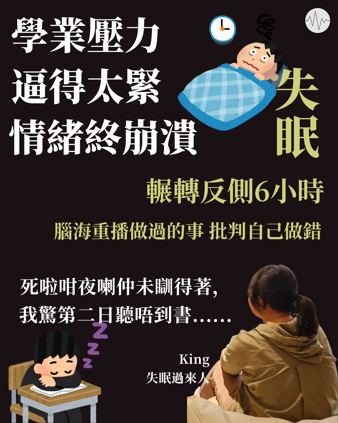 香港學生學業壓力沉重,受失眠困擾的青年並非少數。小童群益會去年底的調查發現,15至17歲受訪青少年平均睡眠時間僅6小時17分鐘,當中僅13%符合每晚睡8至10小時的國際機構建議,而整體6至17歲兒童入睡所需時數更達36分鐘,高於2017年的19分鐘。該會社工熊藝(Aimee)有帶領「睡眠小組」,接觸多名失眠青年,失眠原因包括朋輩關係、學業壓力致情緒困擾,更有人覺得睡覺不重要和浪費時間。